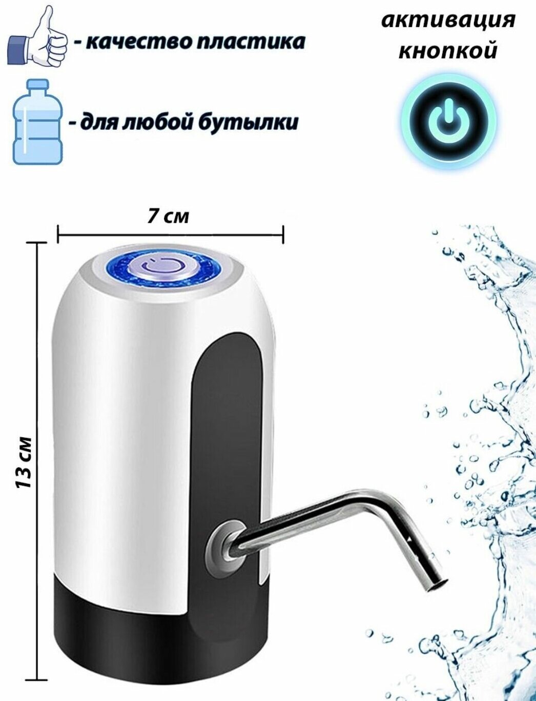 Type: water pump, installation: on a bottle, bottle installation: top, cooling type: without cooling, height: 12 cm, width: 8 cm, depth: 12 cm