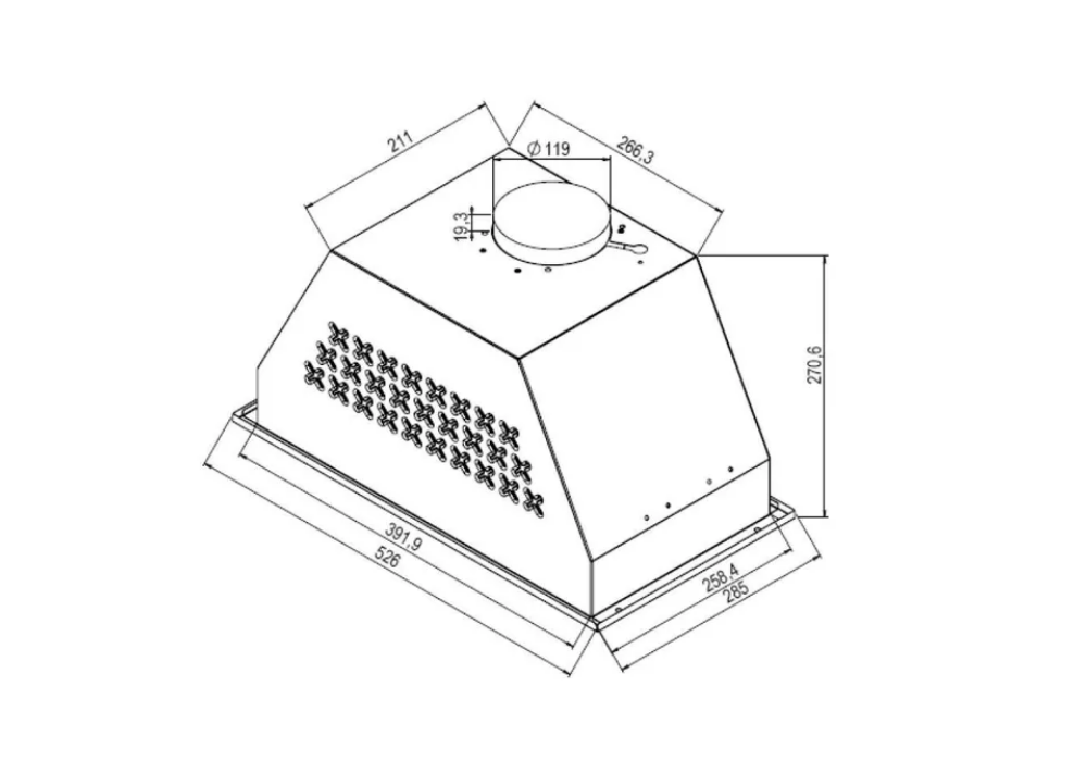 Form factor: built-in, width: 52.60 cm, depth: 28.50 cm, operating modes: exhaust / circulation, installation location: in a cabinet, maximum productivity: 1200 m³/hour, filter: grease, control type: electronic, lighting type