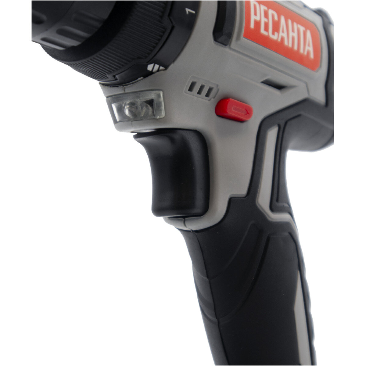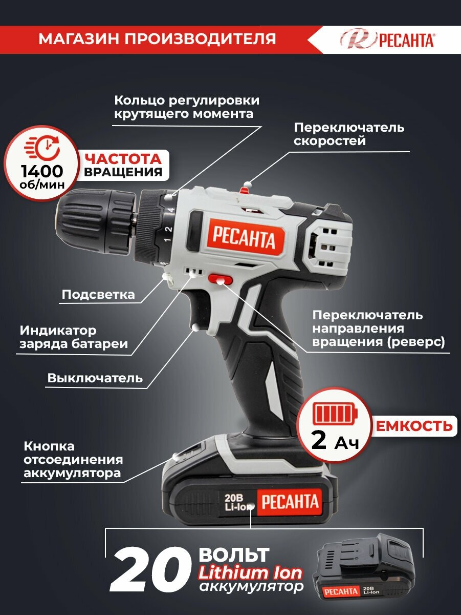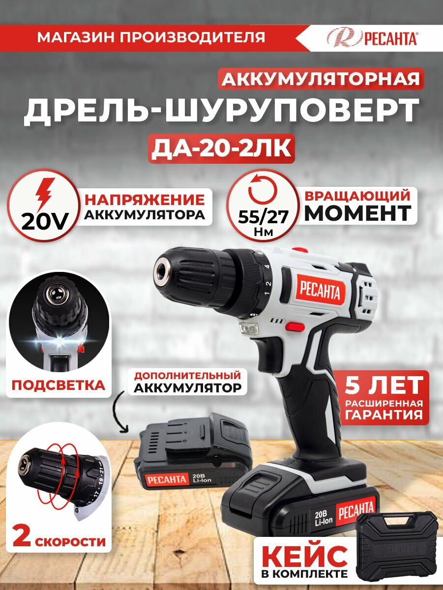 Power button lock, spotlight, drilling depth limiter, spindle lock, battery charge indicator, case included, rubber-coated handles, motor brake