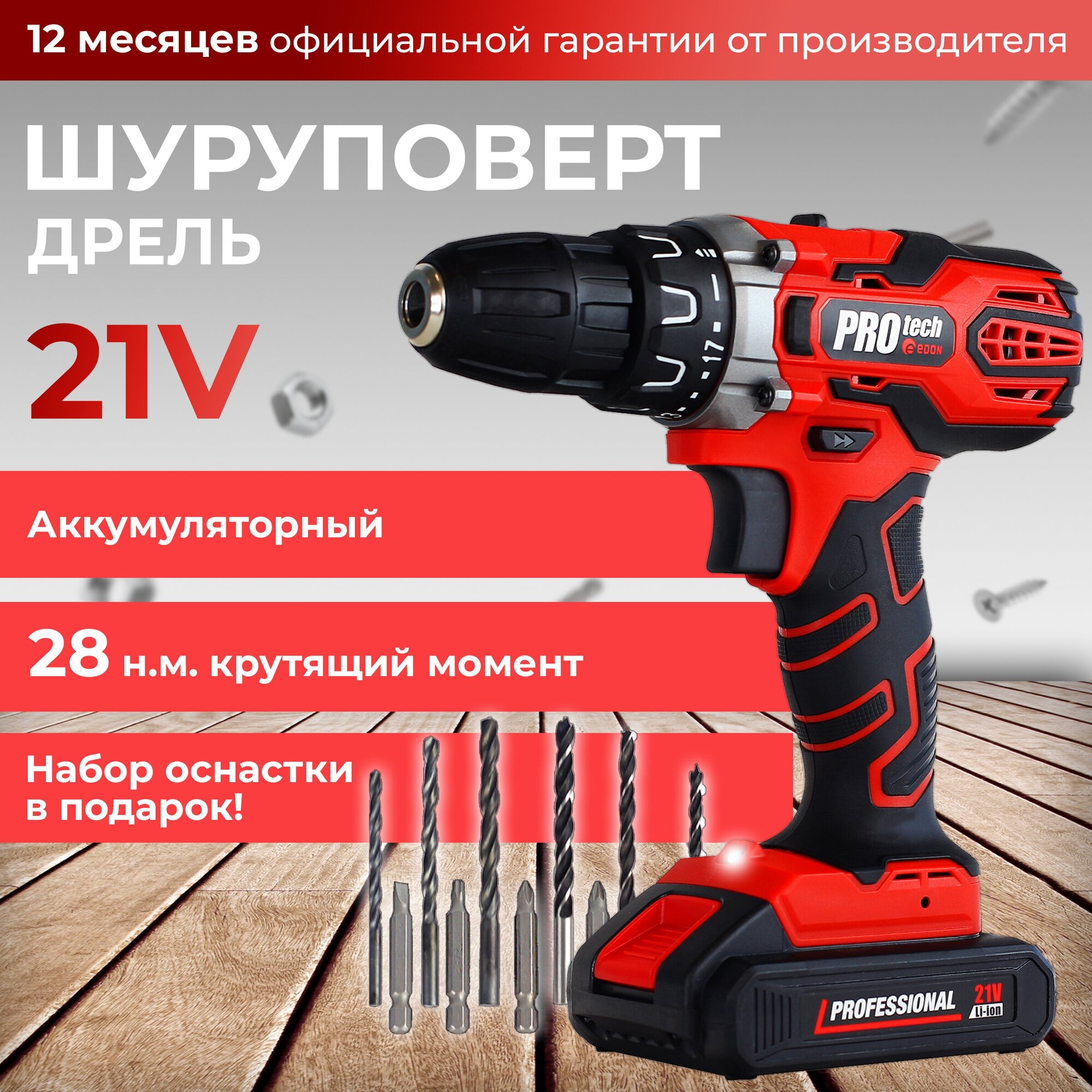 - screwdriver - Li-on battery - 1 pc. - set of accessories: metal drills, wood drills, set of bits and heads - charger - instruction manual