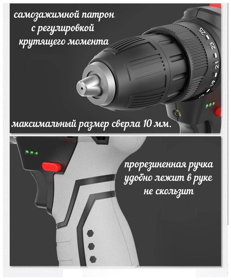 Overload protection, soft start, reverse, Stepless speed control, Quick-release fastening, Continuous speed change, Backlight, Step speed change, brushed