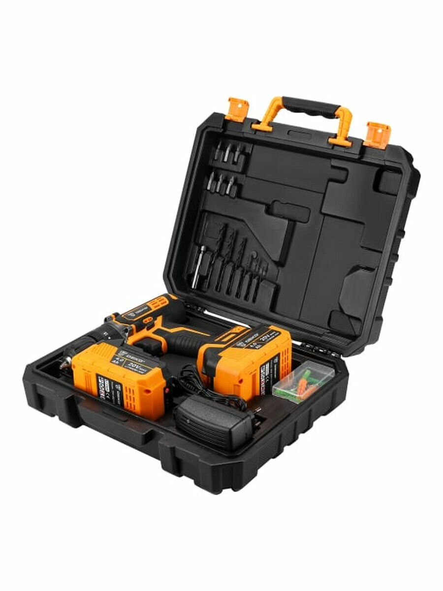 Drill-driver - 1 pc Battery 4.0 Ah, 20V - 2 pcs Charger - 1 pc Drill bits 2, 2.5, 3, 4, 5, 6 mm - 6 pcs Bits SL4, 6, PH1, 2, PZ1, 2 - 6 pcs Magnetic extension 60 mm - 1 pc. Fasteners - 50 pcs. Operation manual - 1 pc.