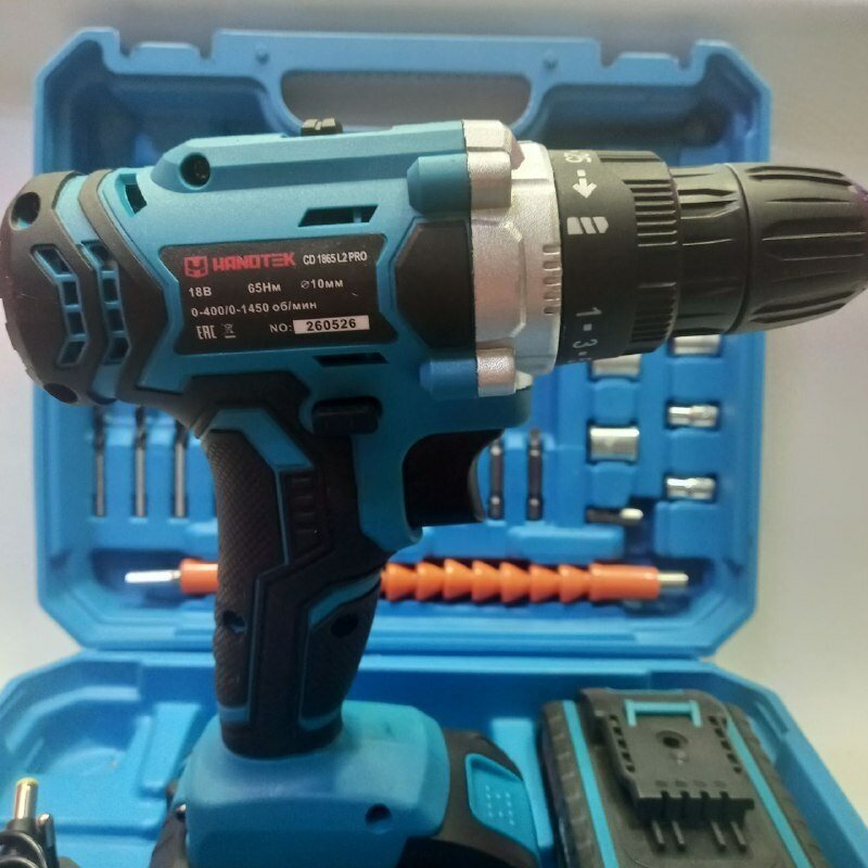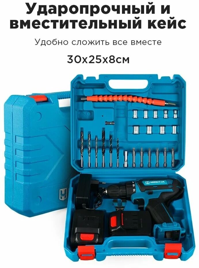 Drill-driver, battery - 2 pcs., plastic case, set of accessories, instruction manual, charger, cordless screwdriver, flexible shaft, drill, screwdriver.