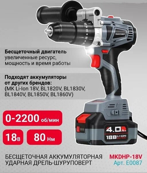 Power supply: battery, battery voltage: 18 V, maximum torque: 80 Nm, number of batteries included: 2, impact, brushless motor, battery capacity: 4 Ah, chuck type: fast
