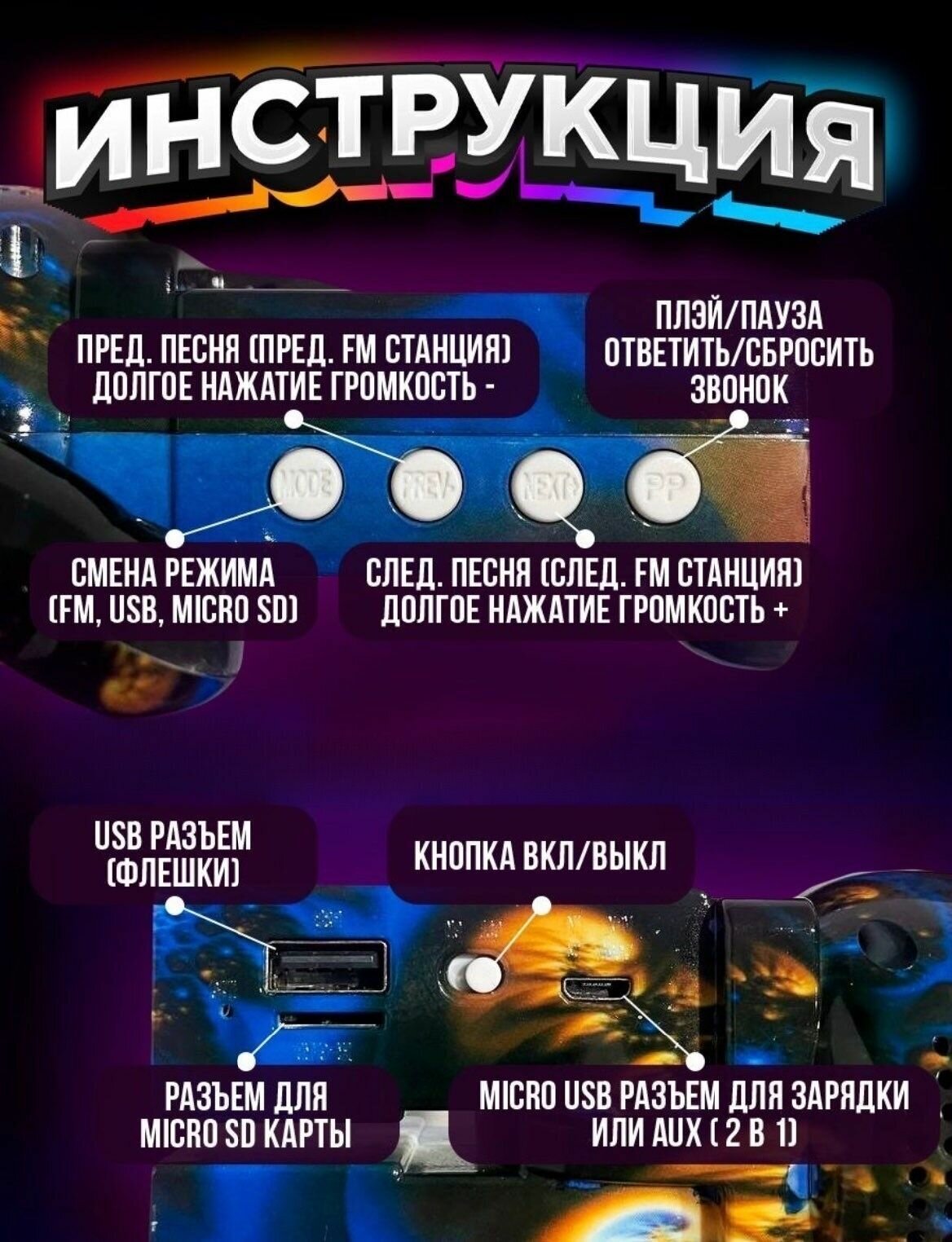 Type: stereo, wireless connection: Bluetooth, connectors and interfaces: USB, microUSB