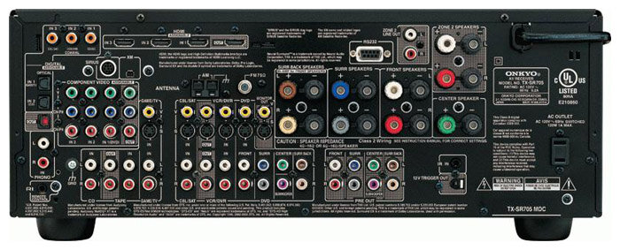 Ethernet - RJ-45, RS-232, 7.1CH in, HDMI in x 3, Coaxial audio in x 2, Optical audio in x 3, Composite video in x 3, Component video in x 3, Mic in x 6, Phono input , 7.1CH output, HDMI output, Preamp output, AU output