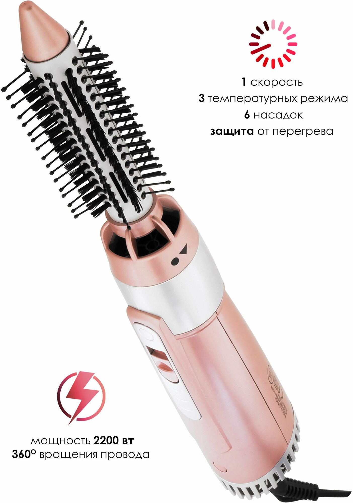Type: hair dryer, hair dryer power: 2200 W, additional functions: ionization, independent adjustment of heating and air flow, cold air supply, attachments: diffuser, concentrator, number of heating modes: 3, quantity