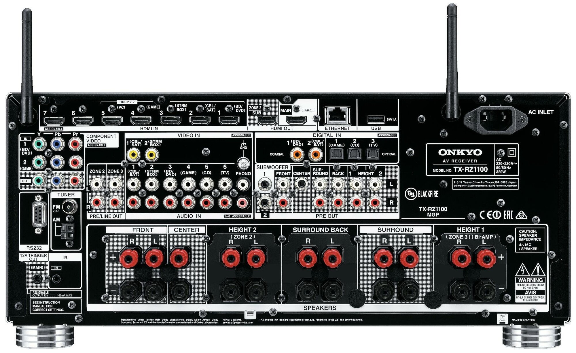 Ethernet - RJ-45, RS-232, USB Type-A, HDMI in x 7, Coaxial audio in x 2, Stereo audio in x 6, Optical audio in x 3, Composite video in x 2, Component video in x 2 , Phono input, 7.1CH output, HDMI output x 2, Pream output