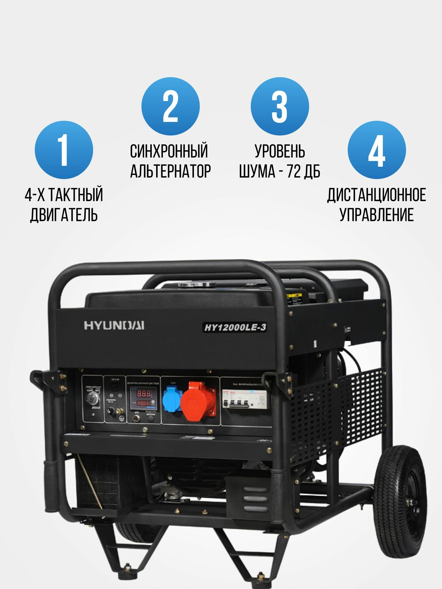 Wheels, Automatic voltage stabilization, Automatic shutdown when the oil level is insufficient, Voltmeter, Oil level sensor, Overheat protection, Overload protection, Hour meter, Electric starter