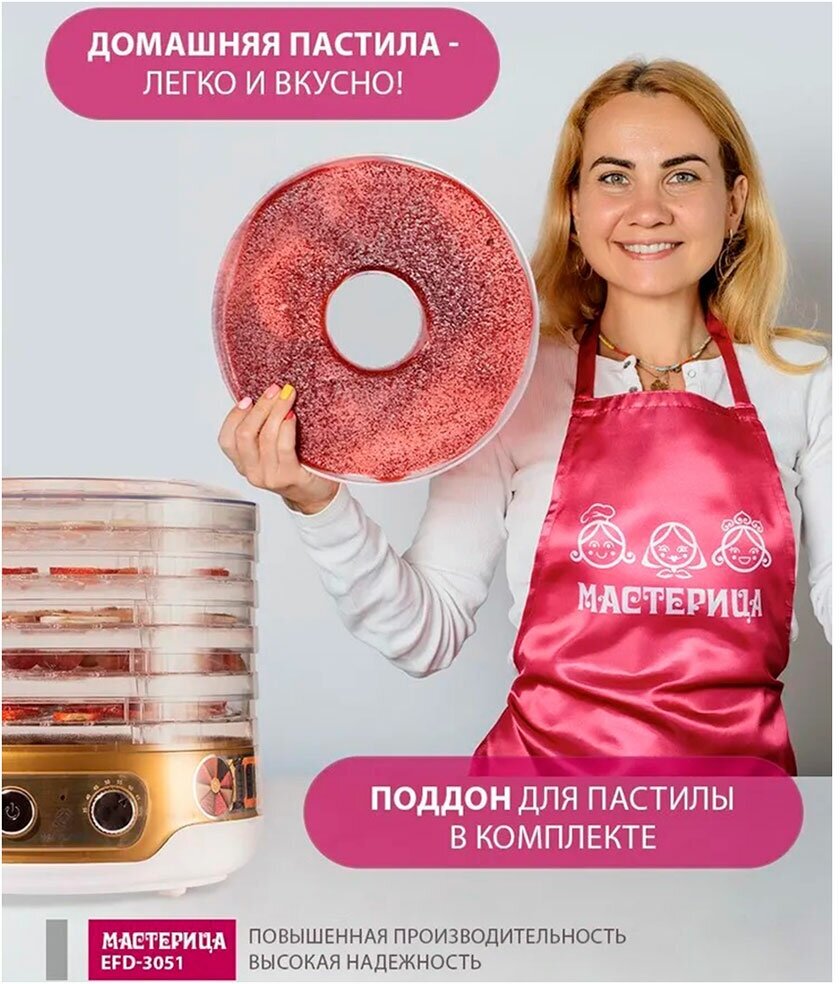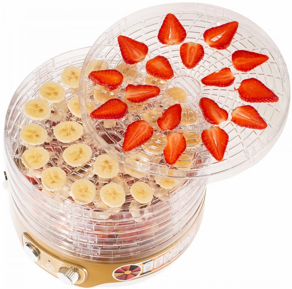 Type: convective, pallet material: transparent plastic, number of pallets: 6, power: 250 W, drying temperature adjustment, control: mechanical, features: overheating protection, power-on indication, regulation