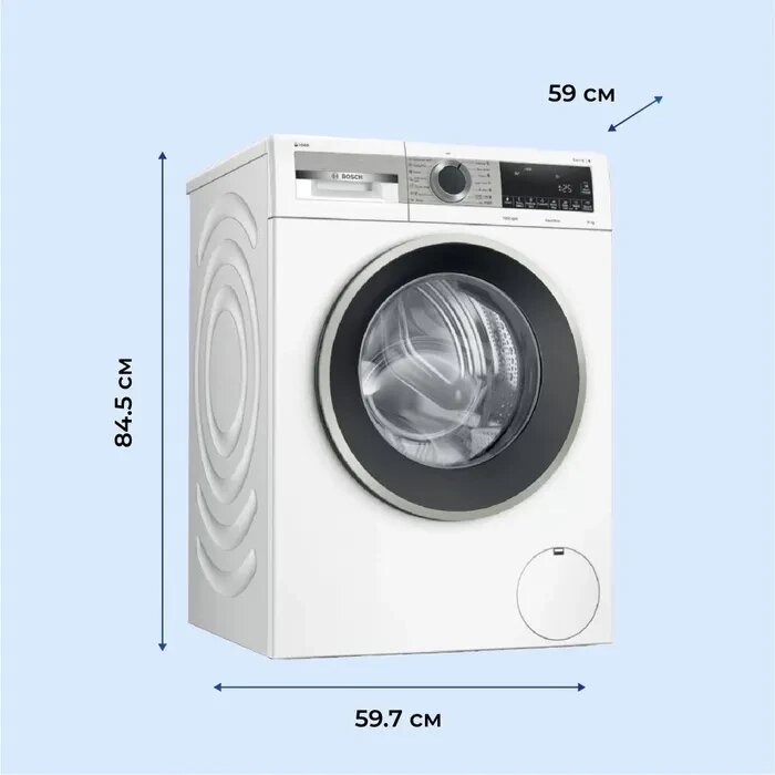 Loading type: front, maximum load of laundry: 9–9.9 kg, installation: free-standing, depth: 58 cm, width: 59.70 cm, height: 84.50 cm, maximum spin speed: 1100–1200 rpm, energy class : A+++, and