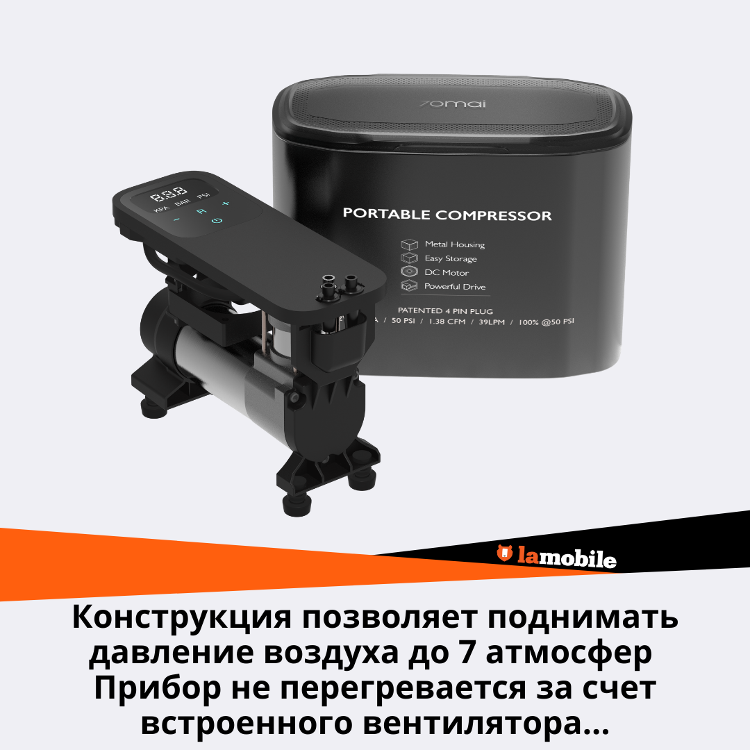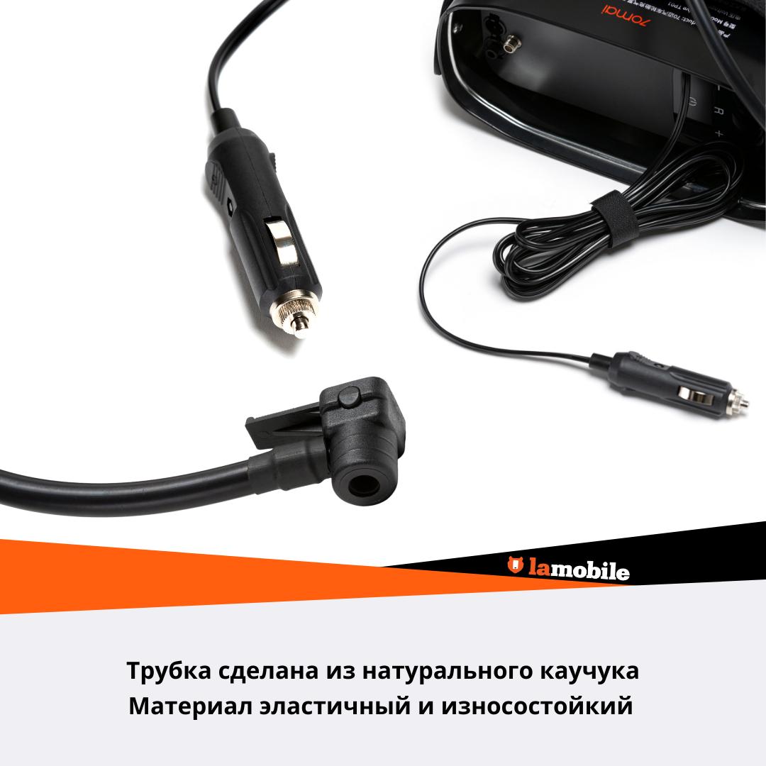 Power supply: from the cigarette lighter socket, voltage: 12 V, inlet capacity: 40 l/min, maximum pressure: 3.50 atm, compressor type: piston, power cable length: 2.80 m, air hose length: 1 m, pressure gauge: analog