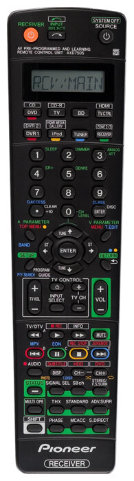 Bi/Tri-amping, FM-tuner, display, connection of additional sets of acoustics, remote control, on-screen menu