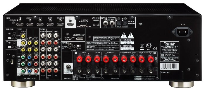 Ethernet - RJ-45, HDMI in x 5, Coaxial audio in x 2, Stereo audio in x 6, Optical audio in x 2, Composite video in x 4, Component video in x 2, HDMI out, Stereo audio out x 3, video component output