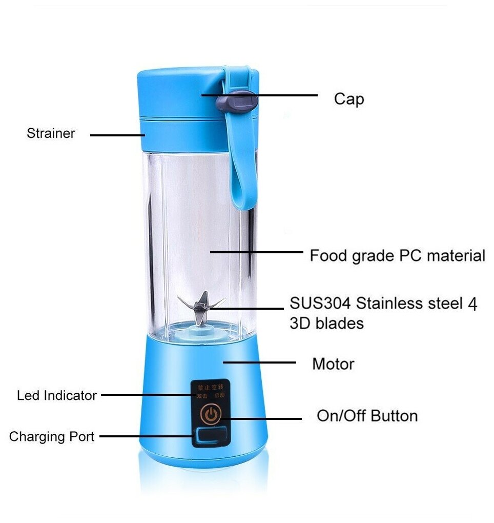 Portable Mini for Smoothies, Juices, Mixing Baby Food, etc., 380 ml, BPA Free, USB Charging - Blue