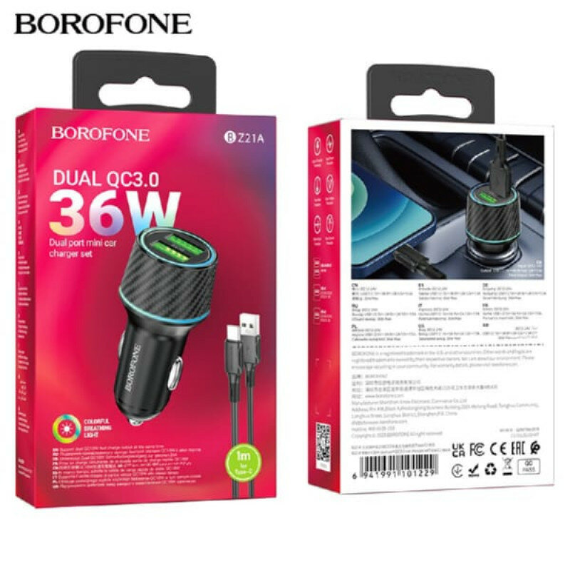 Car charger + Type-C USB cable Borofone BZ21A 36W 2USB QC3.0 1m black
