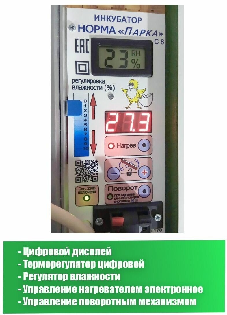 Turning: automatic, type of eggs: duck, features: automatic switching to emergency power, automatic humidity maintenance, auto-rotate trays