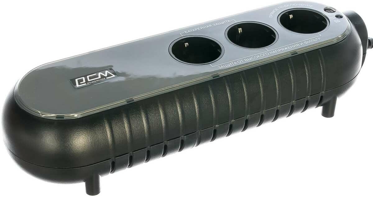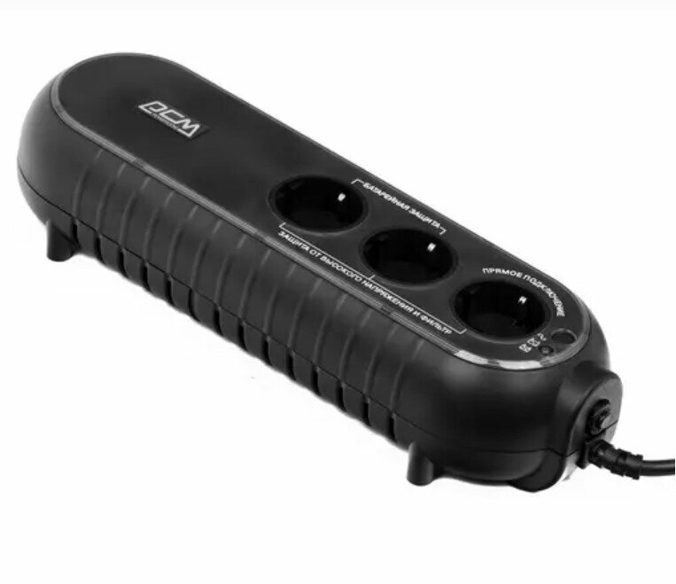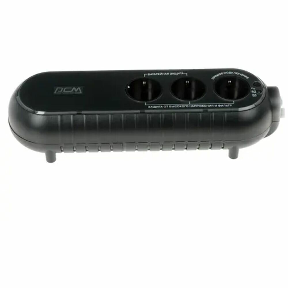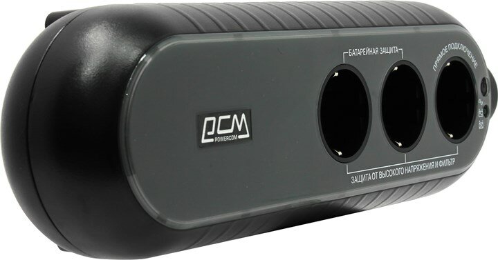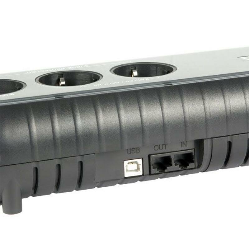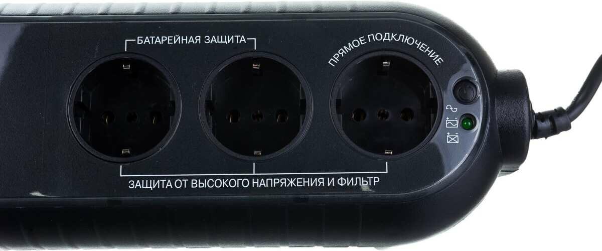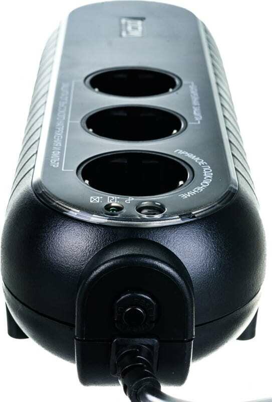 Output connectors: 3xEURO: 2 with backup power, 1 with filtering; UPS overload protection: in mains mode, if the overload exceeds 120% of the nominal value, a continuous sound signal is emitted; backup mode: av