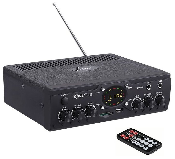 Amplifier with cable 220V EU plug, remote control with battery, instruction in Russian, inner bag made of bubble wrap, box with color printing