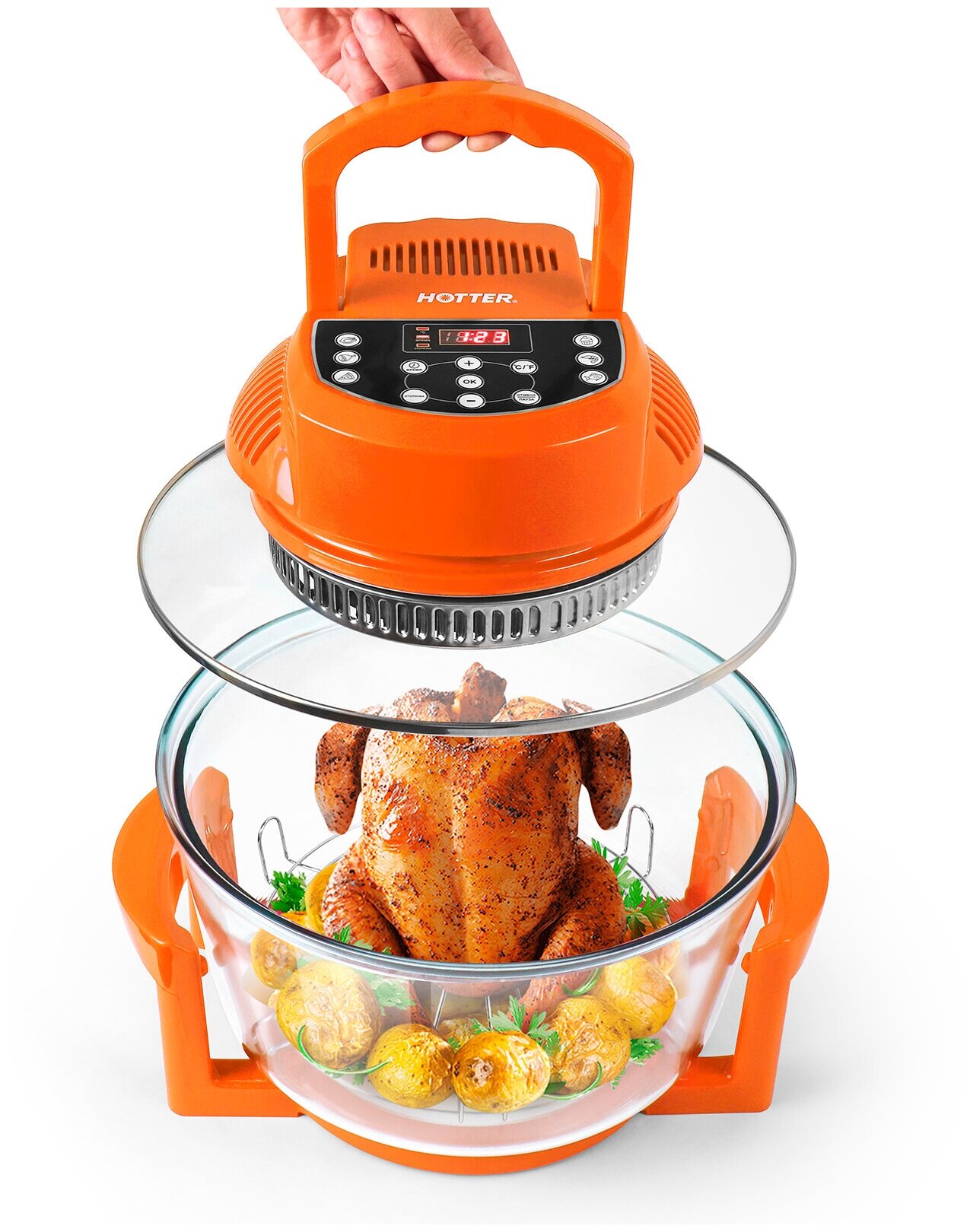 Volume up to 14 liters; complete set: magnifier ring, lower grill, middle grill, upper grill, steamer mesh baking sheet, skewers - 4 pcs, tongs, tongs, poultry roaster, lid stand