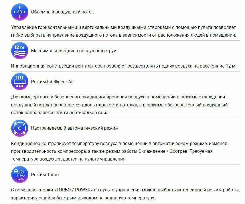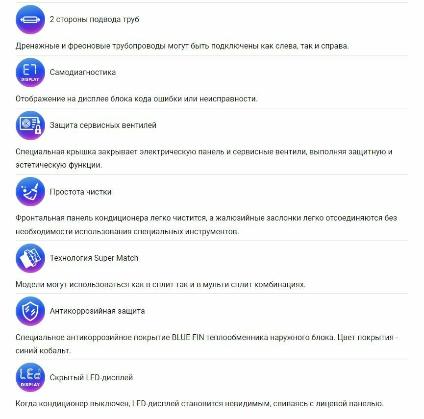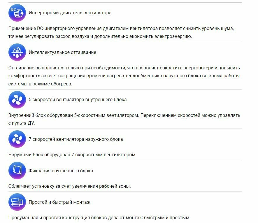 Type of air conditioner: split system, room area: 55 – 79 m², inverter, Air conditioner power BTU: 24, operating mode: heating, cooling, additional modes: ventilation, night, turbo, energy class: A++, Wi-Fi,