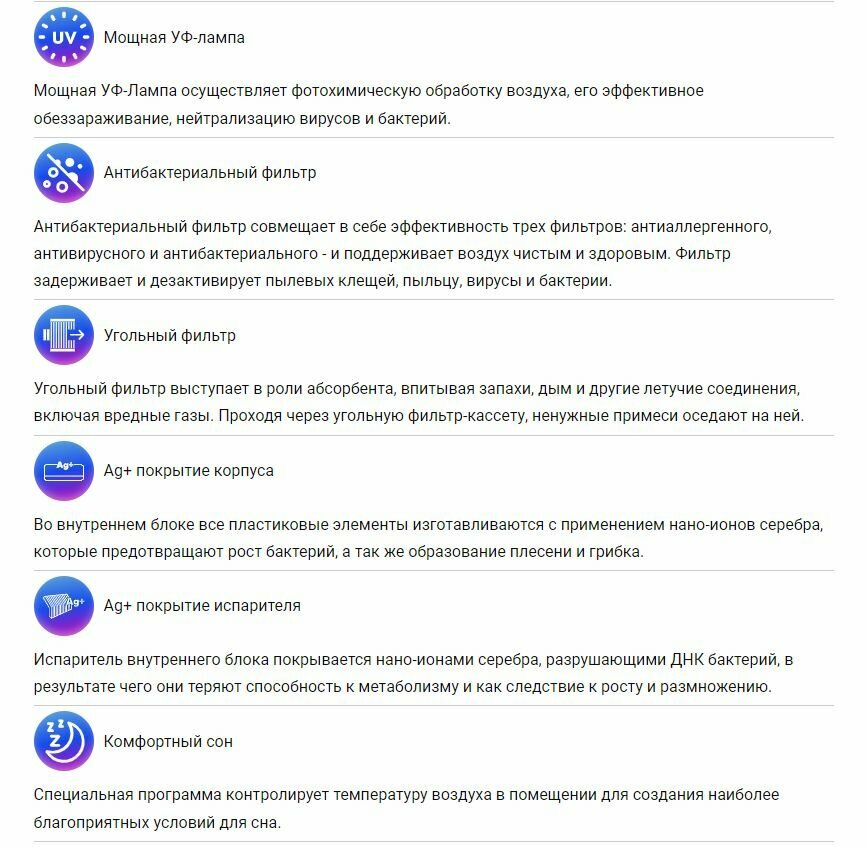 Auto-restart, ionization, self-diagnosis, self-cleaning of the indoor unit, warm start