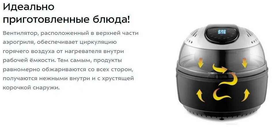Aerogrill — 1 pc. , bowl - 1 pc., skewer - 1 pc. , grate - 1 pc., fork - 2 pcs., basket - 1 pc., tongs - 1 pc.