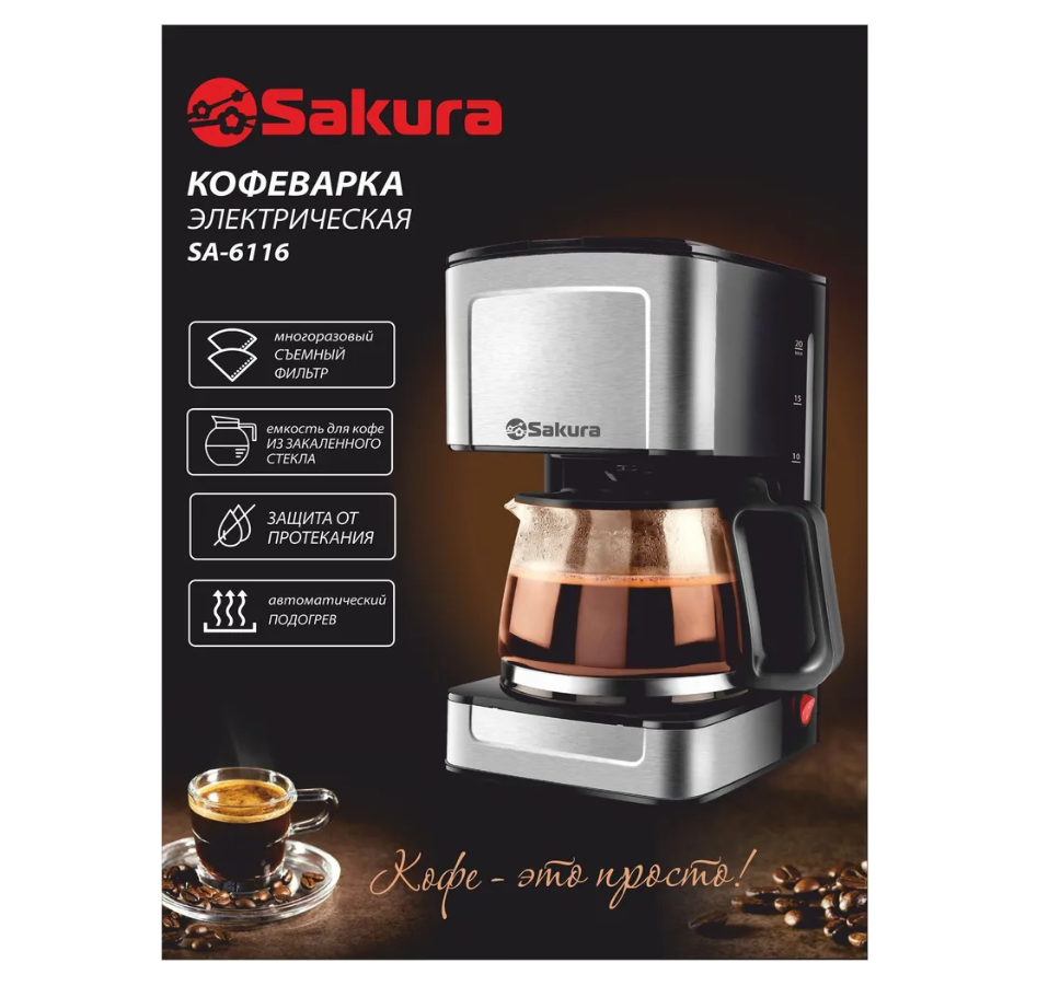 Device type: coffee maker, type: drip, type of coffee used: ground, type of drink: cappuccino, espresso, volume: 0.80 l, design features: power indicator, automatic heating plate, removable tray for collecting drips,