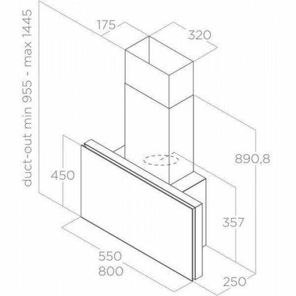 Form factor: dome, width: 80 cm, depth: 25 cm, operating modes: drain / circulation, installation location: in a cabinet, maximum productivity: 1200 m³/hour, installation type: wall-mounted, filter: grease, control type: electric
