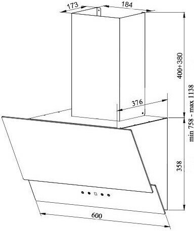 Form factor: inclined, width: 60 cm, depth: 37.60 cm, maximum productivity: 900 m³/hour, installation type: wall-mounted, lighting type: LED, maximum noise level: 48 dB, installation width: 60 cm, power d