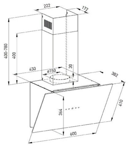 Form factor: inclined, width: 60 cm, depth: 38.20 cm, operating modes: exhaust / circulation, maximum productivity: 1000 m³/hour, filter: grease, lighting type: LED, maximum noise level: 44 dB, built-in width