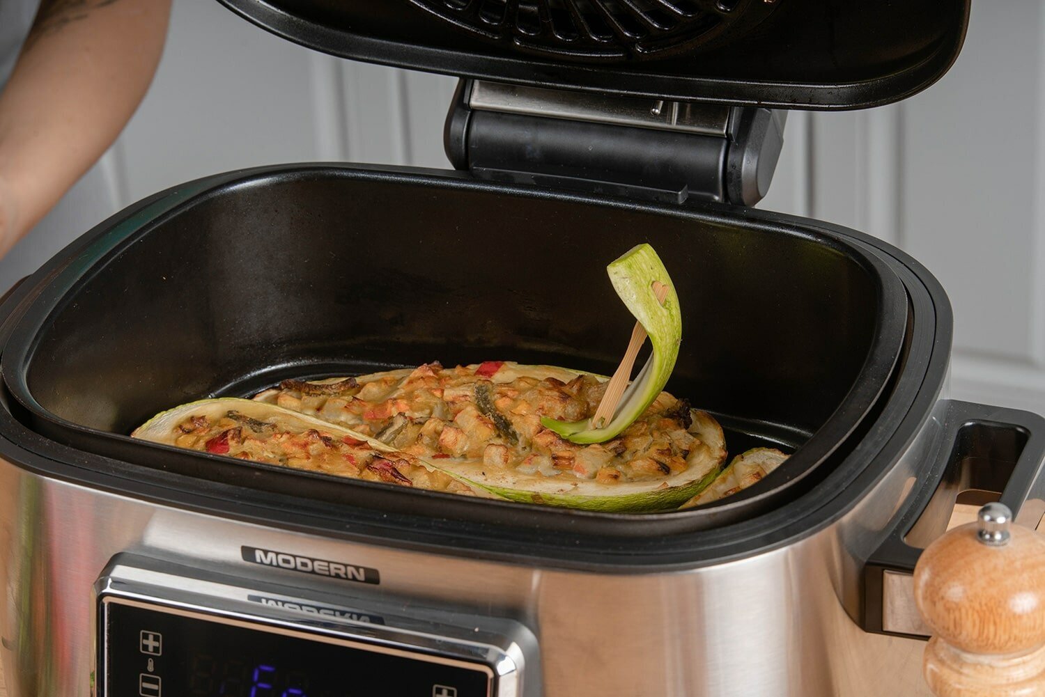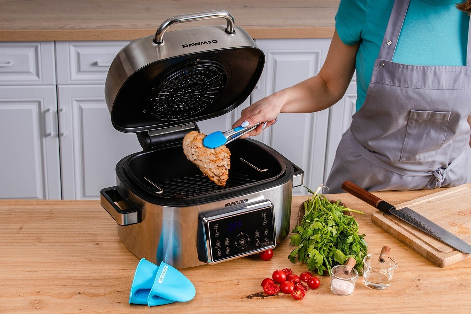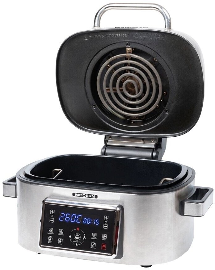 3D airflow, uniform roasting, oil-free cooking, stainless steel housing, touch control panel, non-stick coating