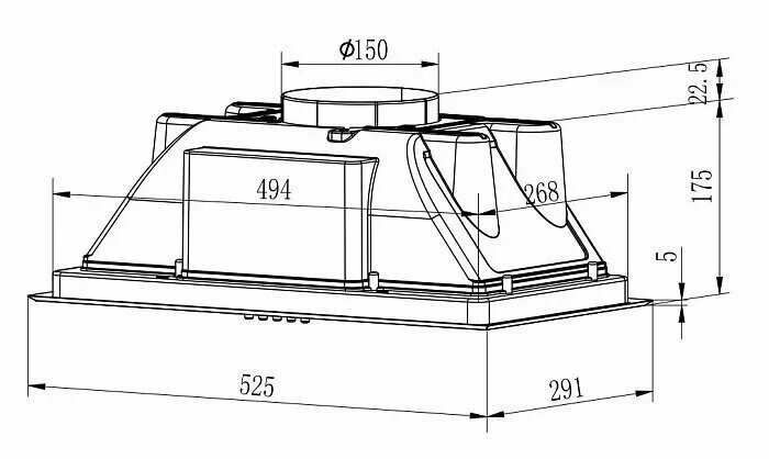 Form factor: built-in, width: 52 cm, depth: 29.10 cm, operating modes: drain / circulation, installation location: in a cabinet, maximum productivity: 750 m³/hour, filter: grease, control type: mechanical, lighting type