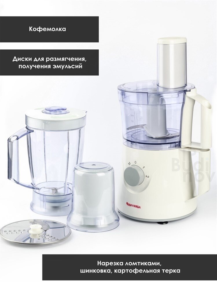 | Detailed equipment: | Chopper - 1.2 l., blender - 1.5 l. Attachments: utility knife, dough attachment, emulsion attachment, grater, slicing attachment. The total number of nozzles is 7. |