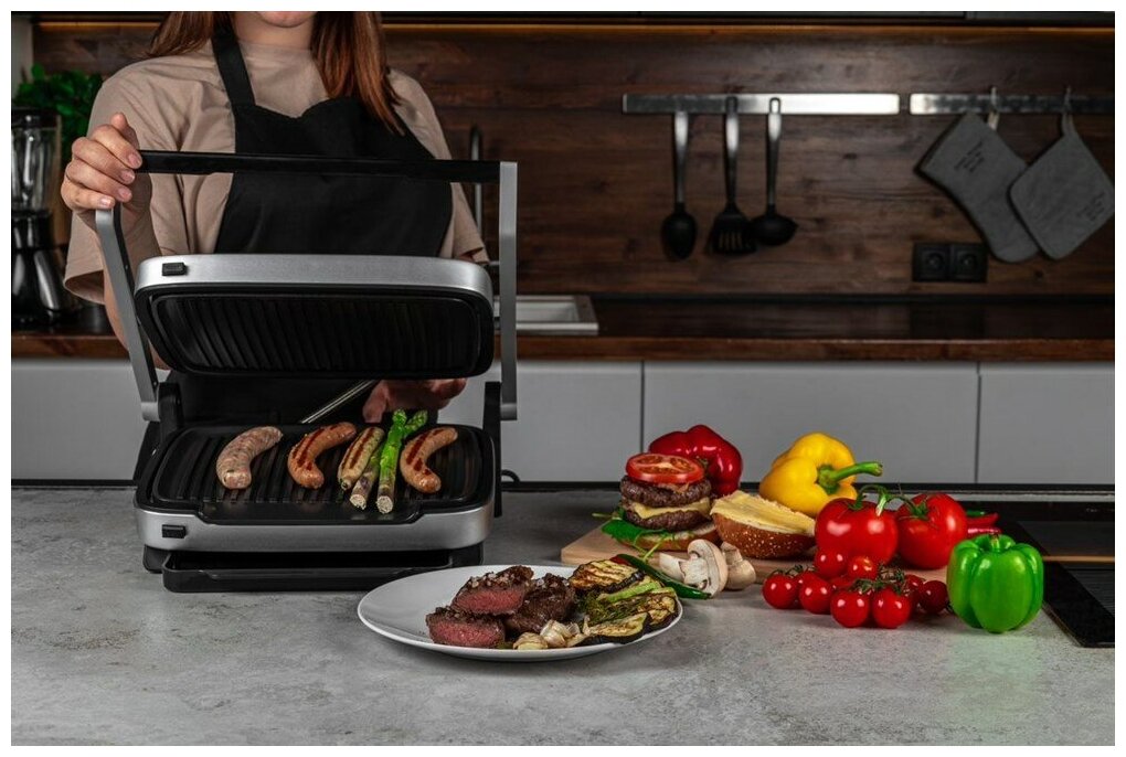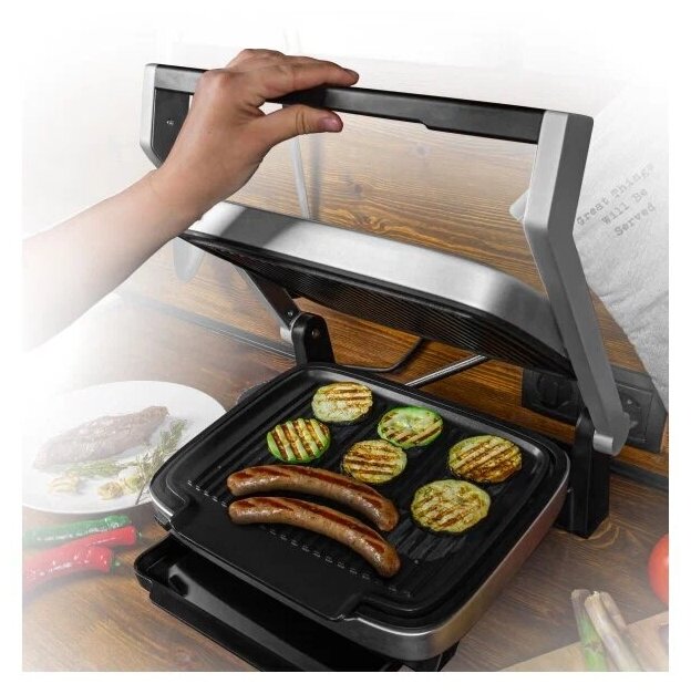Non-stick coating, contact grill, drip tray, top plate height adjustment, wire rack, Replaceable cooking plates