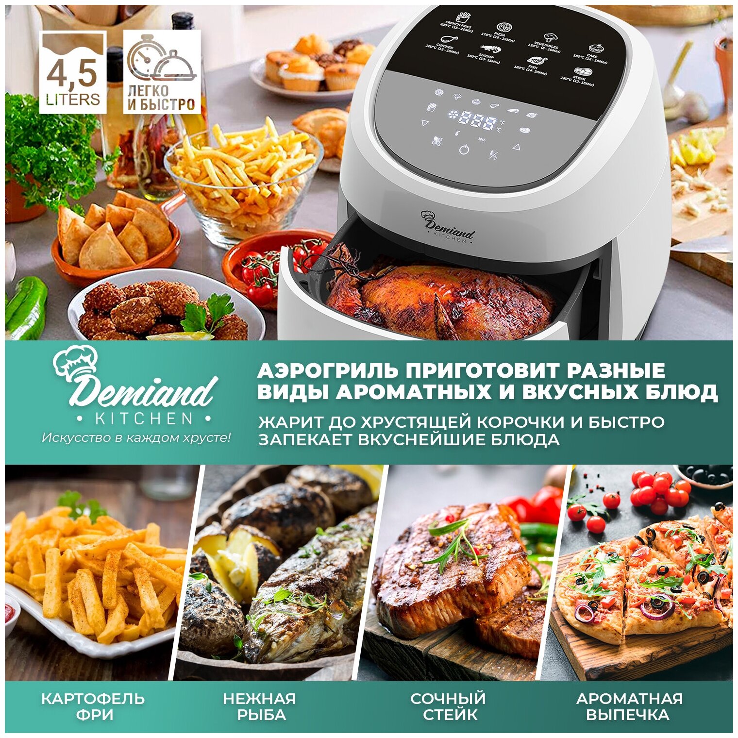 DEMIAND, with fryer, grill, oven, toaster, mini-oven functions, removable grid, basket, 8 programs, recipe book, 4.5l, 1400W