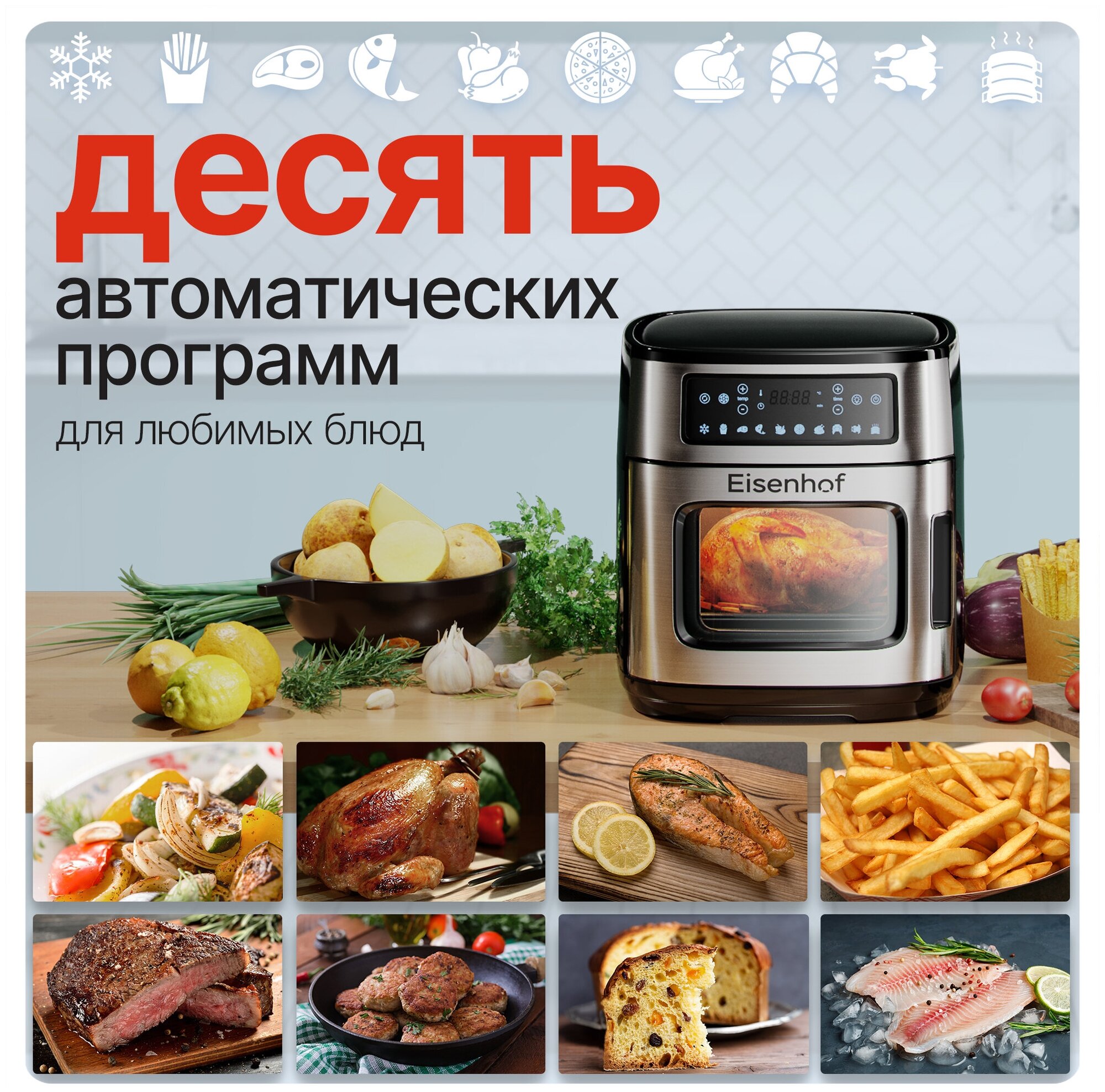 Temperature control with light indicator, automatic locking if the lid is incorrectly installed, non-heating handles; set includes: lid rack, poultry rack, toast rack, shackle