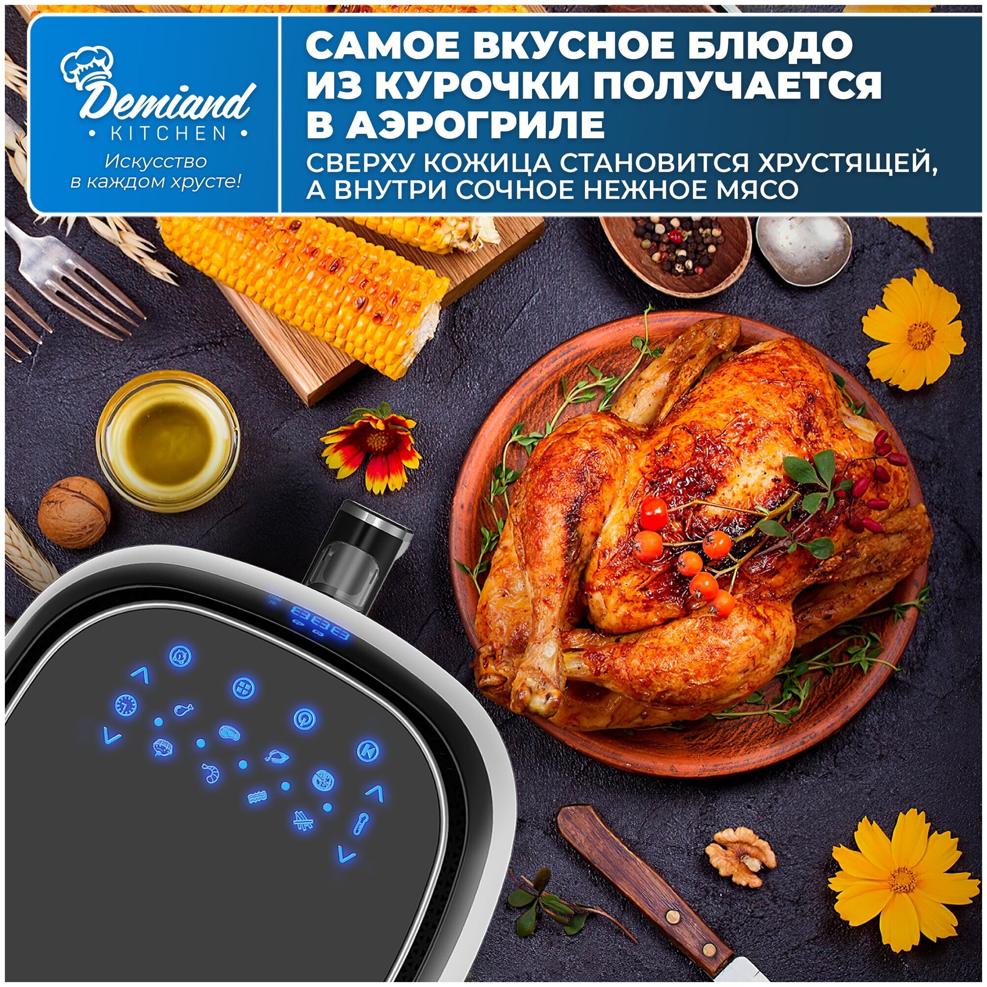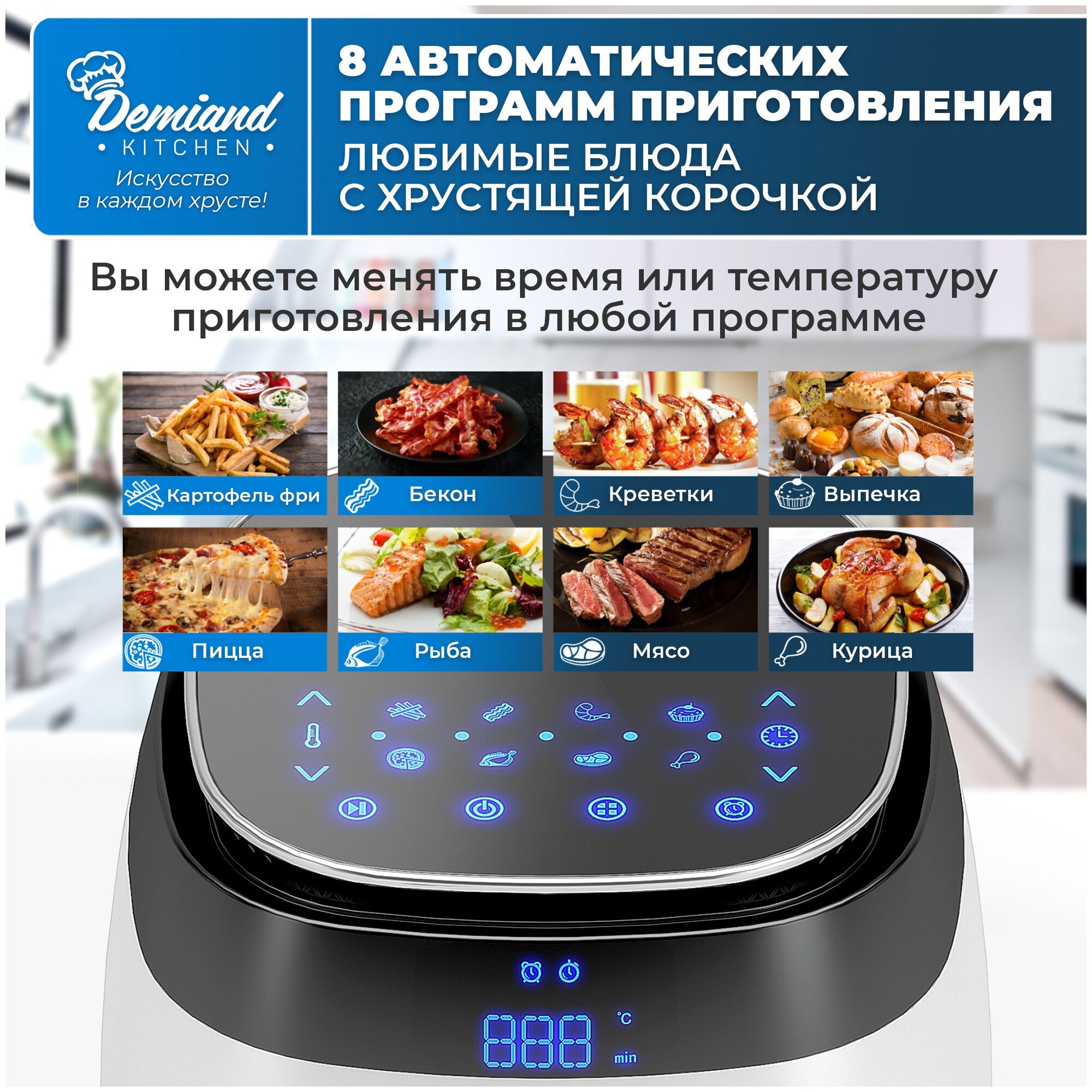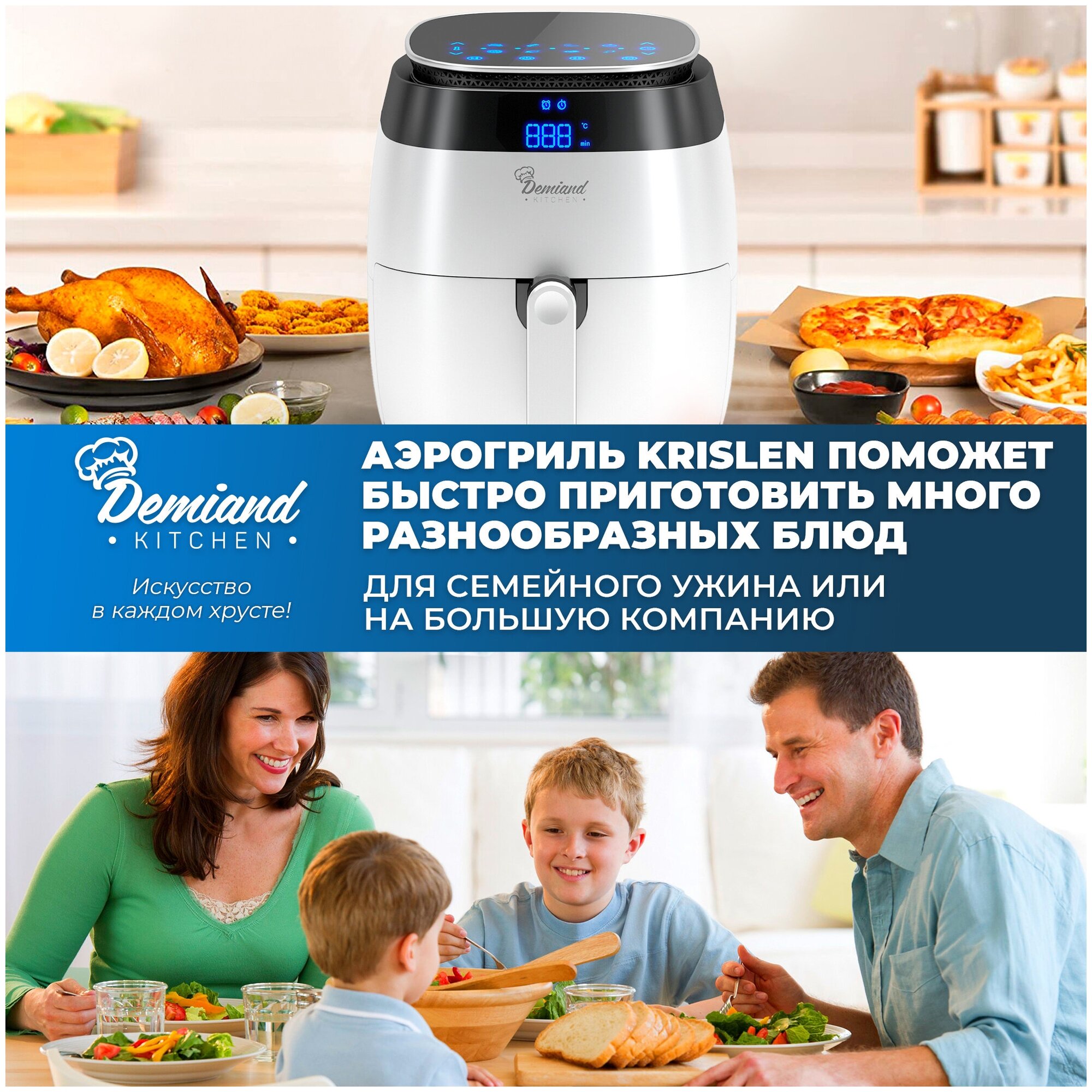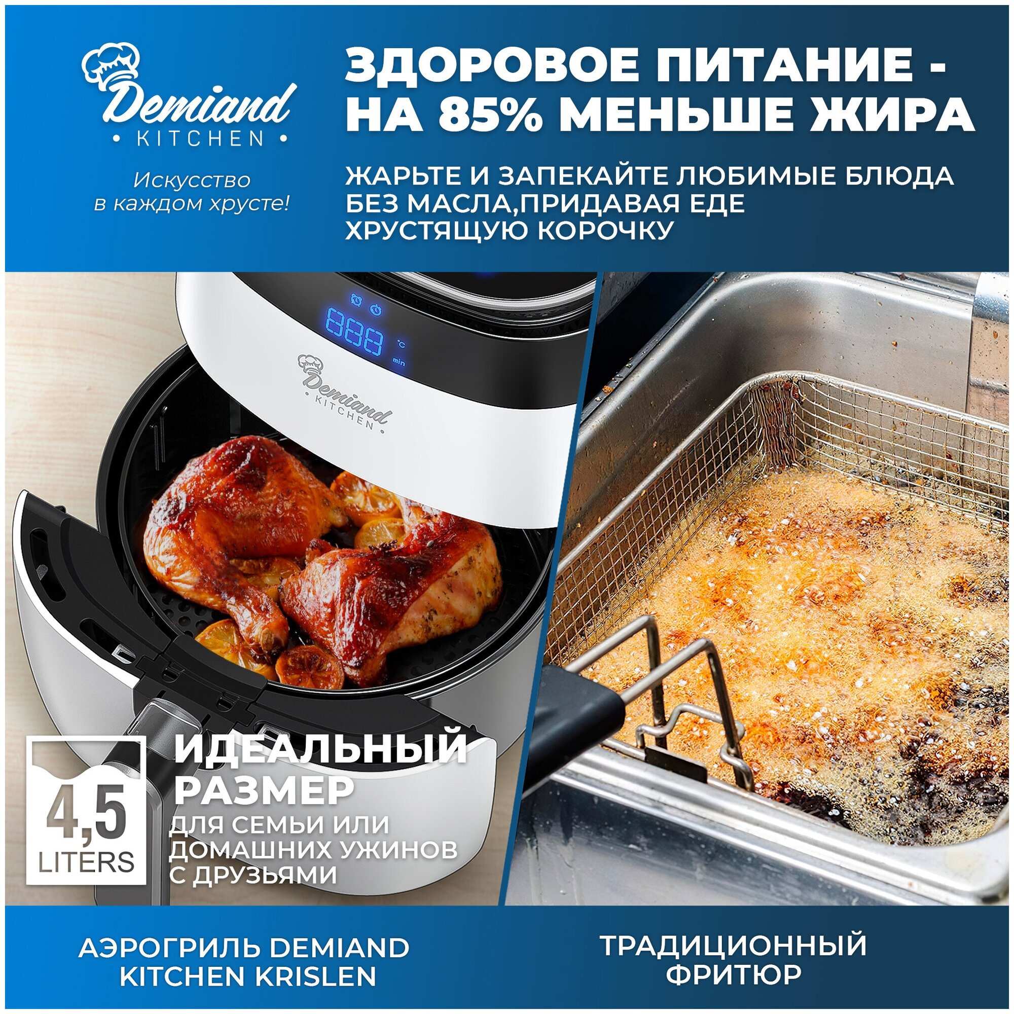 - High power of the device 1500W - 8 automatic programs - Three-dimensional blowing - Thoughtful ventilation - Smart pause - Compact size of the device - Volume 4.5 liters - Non-stick coating of the bowl - Removable basket included