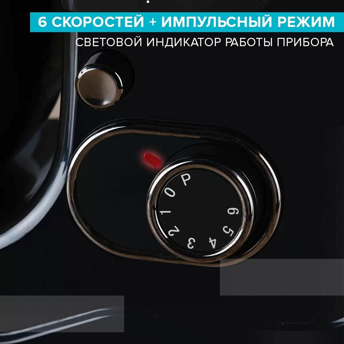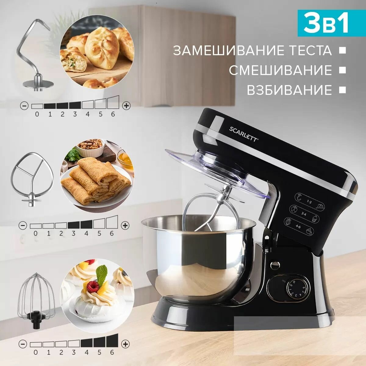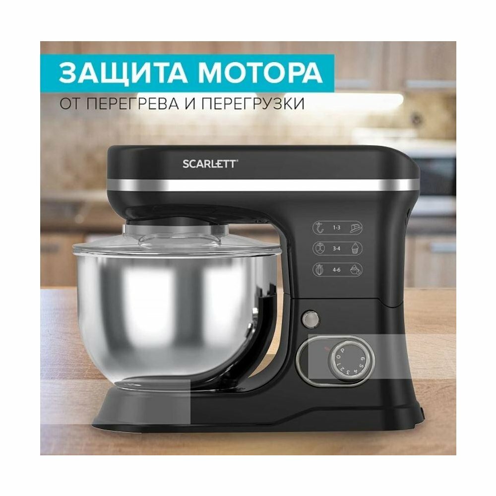 Type: planetary stationary, power: 1100 W, attachments: whisk for whipping, hooks for kneading dough, bowl material: stainless steel, bowl volume: 5 l, body material: plastic, additional modes: pulse �