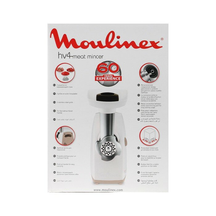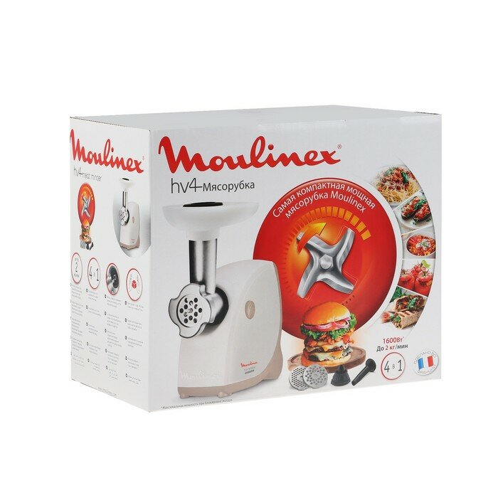 Rated power: 400 W, attachments: mince disc, kebbe attachment, sausage attachment, body material: plastic, reverse system, capacity: 2 kg/min, features: overload protection, compartment