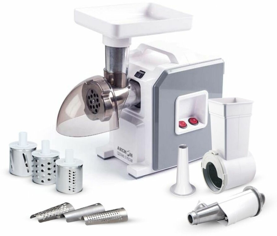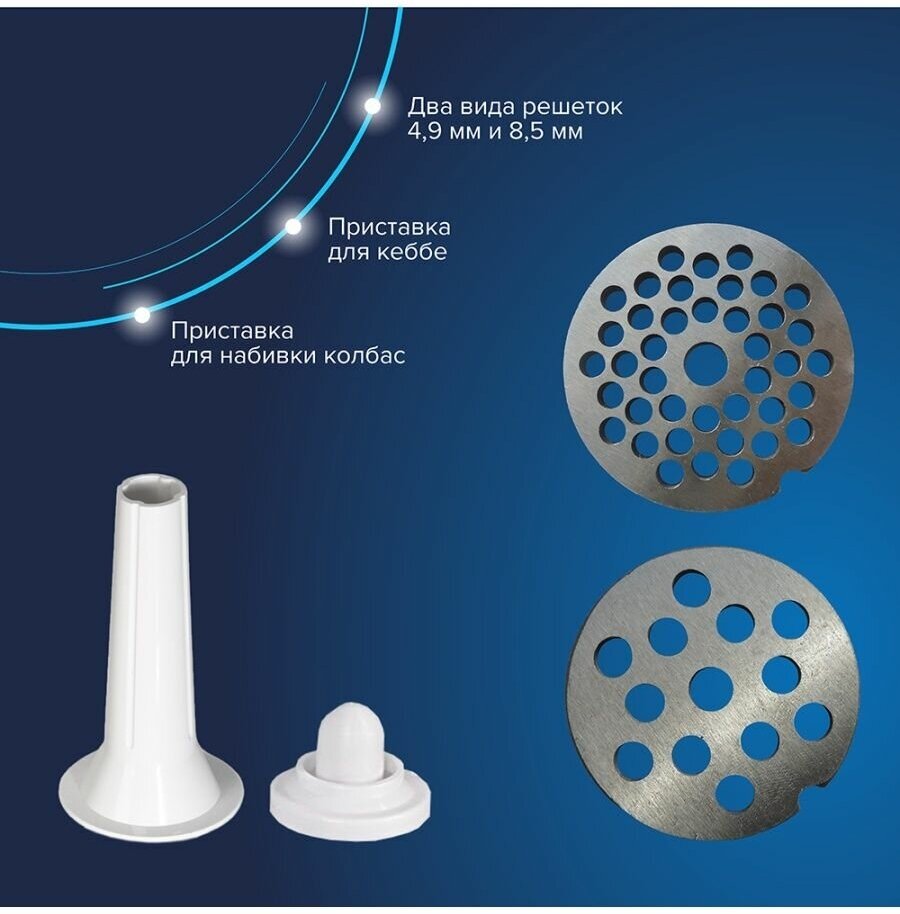 Attachments: disk for minced meat, attachment for kebbe, attachment for preparing sausages, attachment for shredding, juicer, body material: plastic, reverse system, capacity: 2 kg/min, features: overload protection