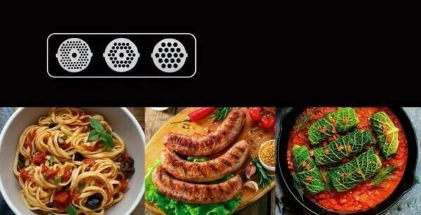 Nozzles: nozzle for preparing sausages, body material: plastic, reverse system, features: overload protection, compartment for storing nozzles, number of perforated discs: 3