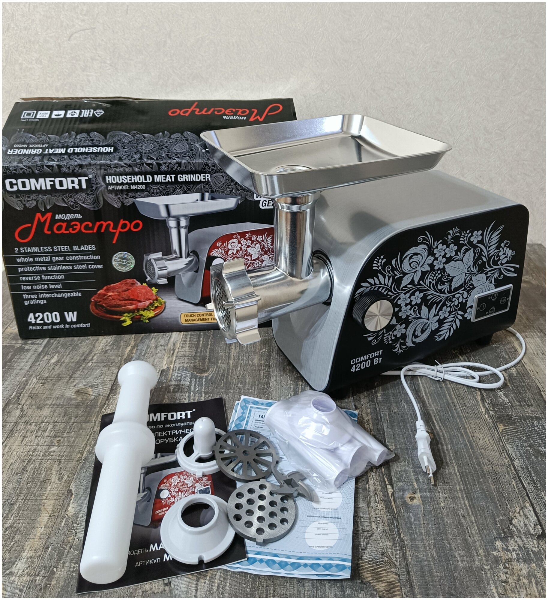 Nozzles: disk for minced meat, nozzle for preparing sausages, body material: plastic/metal, reverse system, productivity: 3 kg/min, features: overload protection, rubberized feet, self-sharpening knife,