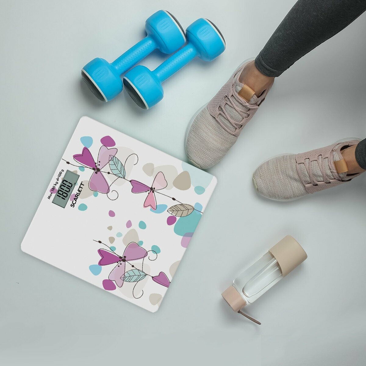 Scale type: electronic, maximum load: 180 kg, battery type: CR2032, measurement accuracy: 100 g, platform material: plastic, glass