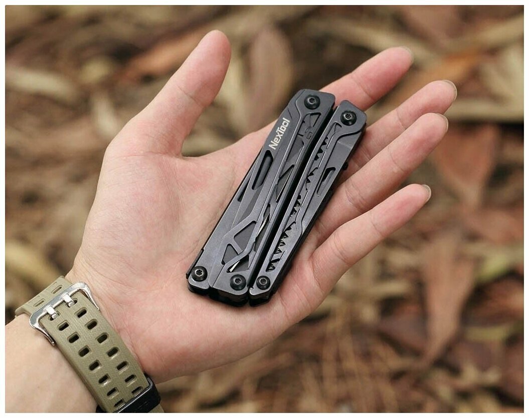 Type: multitool, multitool type: pliers, knife type: multifunctional, blade length: 100 mm, tools functions: nut grip, wire cutters, knife, scissors, flint, screwdriver, bottle opener, pliers, saw, flat blade