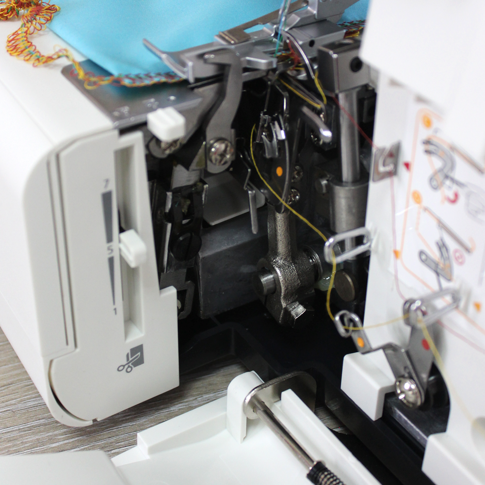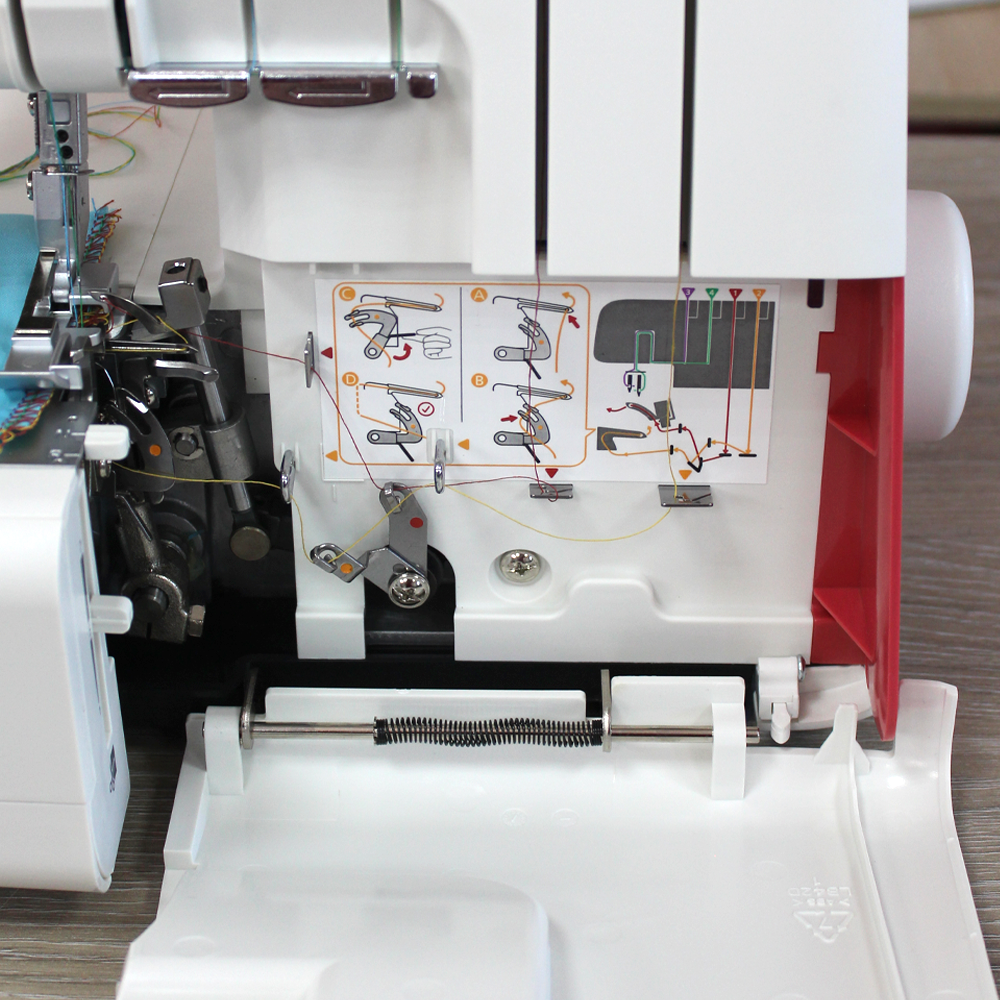 Convenient lower looper threading system; 4 colored guides for easy threading; differential material feed from 0.7 to 2.0 to avoid wrinkles when working with even the thinnest and most elastic fabric; di