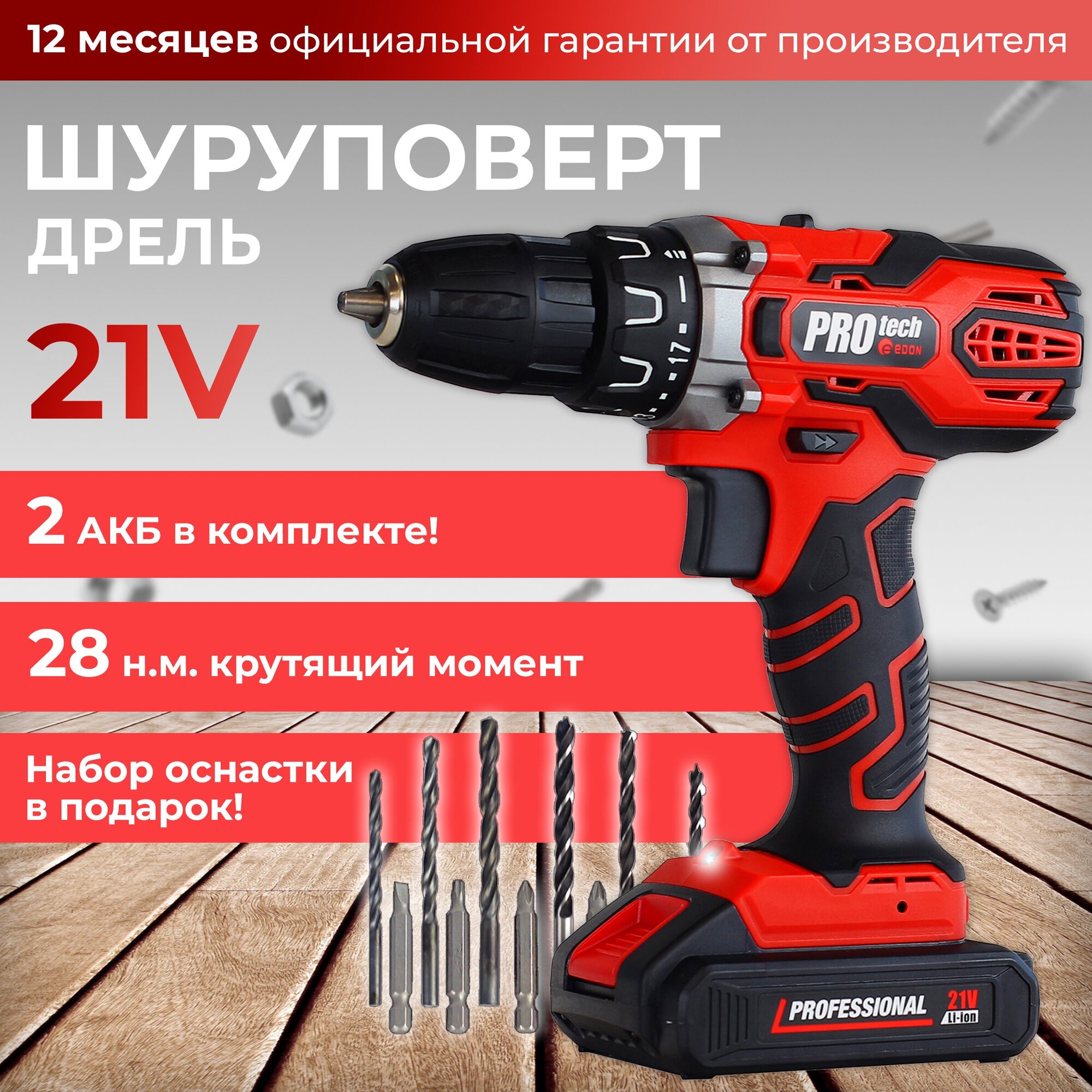 Power supply: battery, battery voltage: 21 V, maximum torque: 28 Nm, number of batteries included: 2, power consumption: 220 W, chuck type: quick-release, max. wood drilling diameter