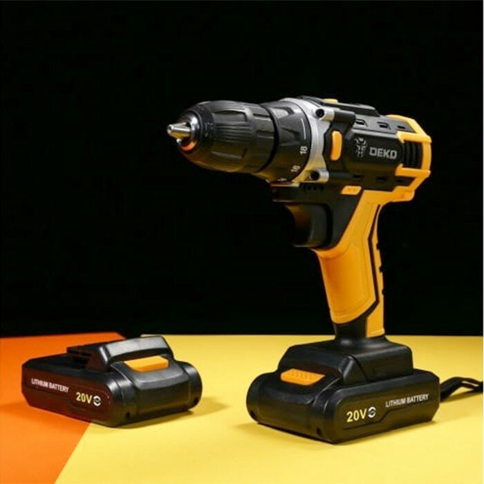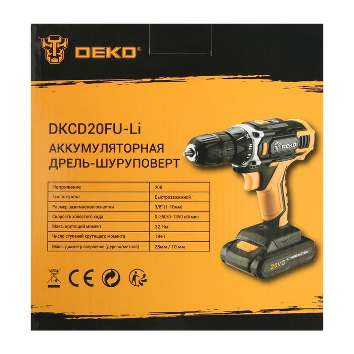 Drill-driver Deko DKCD20FU-Li, 20 V, 1.5 Ah, Li-lon, 32 Nm, 350/1350 rpm