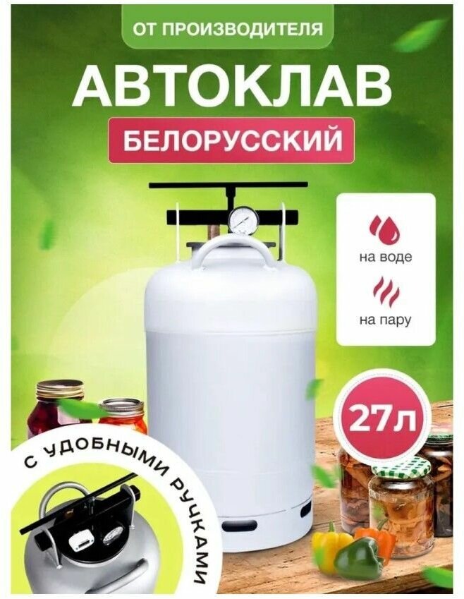 Belorussky autoclave 27 l, check valve, pressure relief valve, warranty card, pressure gauge, rubber gasket under the lid, instructions, recipe brochure
