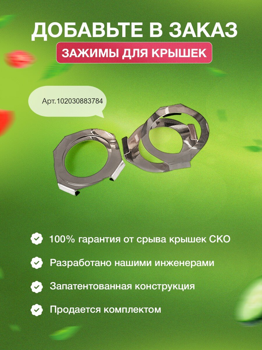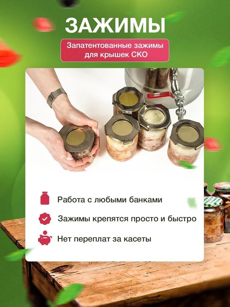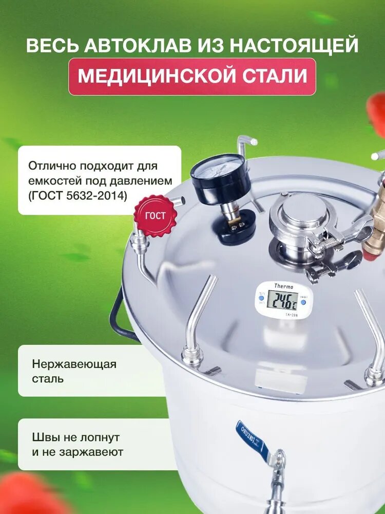 PVC tube - d=7, pressure relief valve, clamp connection, false bottom, autoclave body, pressure gauge, clamping screws - 6 pcs, silicone gasket, electronic thermometer, drain valve, autoclave lid, recipe brochure, g